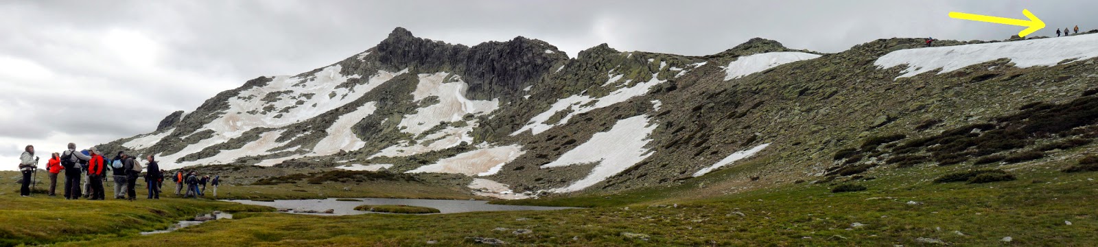 Terminado el tramo rocoso y pedregoso de bajada, al llegar al camino-senda, el personal por fin se relaja y el ambiente ya es más distendido camino de la Laguna de los Pájaros, en donde al llegar, vemos que la temperatura ha subido un poco conforme hemos ido bajando, y la niebla en este lado de la sierra es inexistente, aunque un cielo plúmbeo amenaza con ponerse a llover de un momento a otro, así que la supuesta parada para comer en el entorno de esta laguna, una vez pasadas las dificultades y con la gente ya más relajada y disfrutando es descartada, así que tras las fotos de grupo de rigor, todos seguimos el sendero, ahora en descenso, disfrutando de las vistas, a nuestra derecha, del Risco de los Claveles, por donde habíamos pasado hacía un rato, y viendo que sobre él iban pasando gente todavía, cual hormigas diminutas encaramadas allá en lo alto, para después seguir disfrutando de las vistas de las sucesivas lagunas y de los innumerables riachuelos por los que íbamos pasando, con unas aguas que bajan estrepitosas, raudas y frías, todo producto del deshielo.