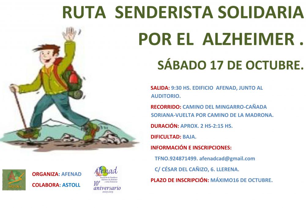 El próximo sábado, día 17, a las 9:30 AFENAD organiza una ruta senderista, con la colaboración de ASTOLL. La salida se realizará a las 9,30 h. desde el edificio Afenad, junto al Auditorio; el recorrido será Camino del Mingarro-Cañada Soriana- y vuelta por camino de la Madrona; la duración será aproximadamente de dos horas con una dificultad baja. Todos los interesados en participar en esta actividad pueden ver más información y forma de inscripción PINCHANDO AQUÍ.