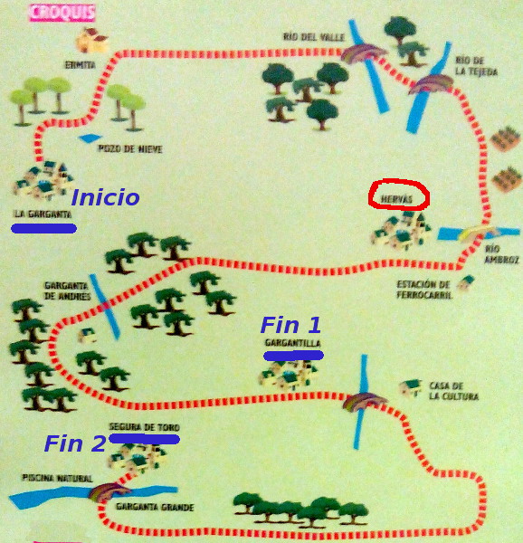 La ruta de los “Bosques del Ambroz” se inicia en el pueblo La Garganta, al que accederemos en bus desde Hervás y dejando atrás Baños de Montemayor, a una altura de unos 1.150 m., y aunque termina en Segura de Toro (casi 22 km ), lo que hemos hecho en otras ocasiones es terminarla en la localidad de La Gargantilla (16,5 km), donde nos recogería el autobús, teniendo la tarde libre para poder realizar otras actividades, aunque también podía decidirse hacerla completa.
