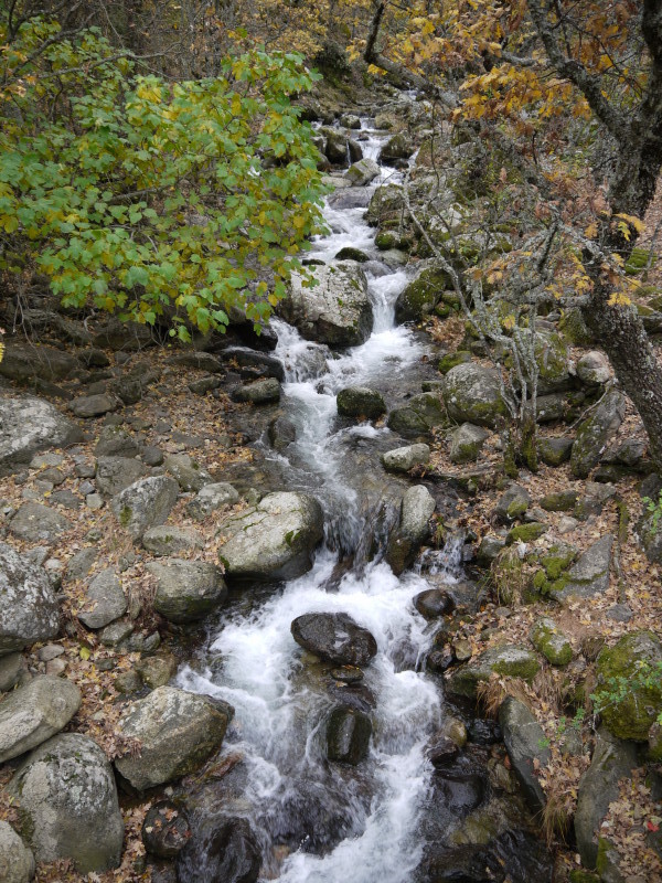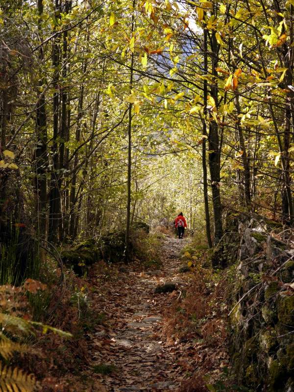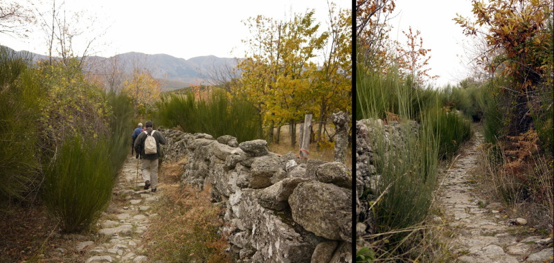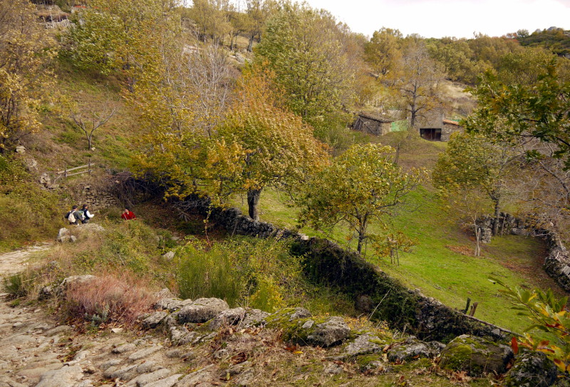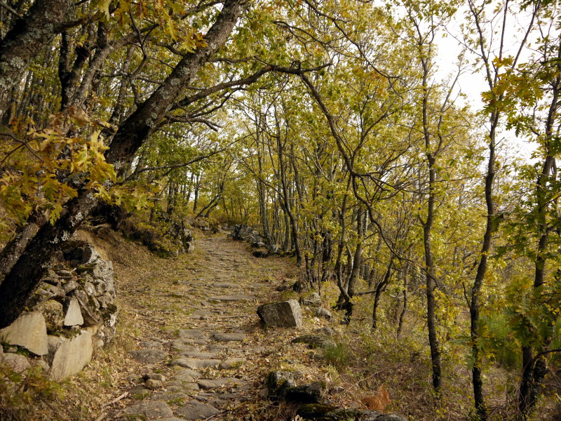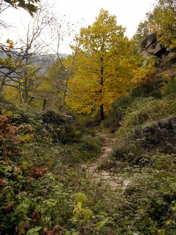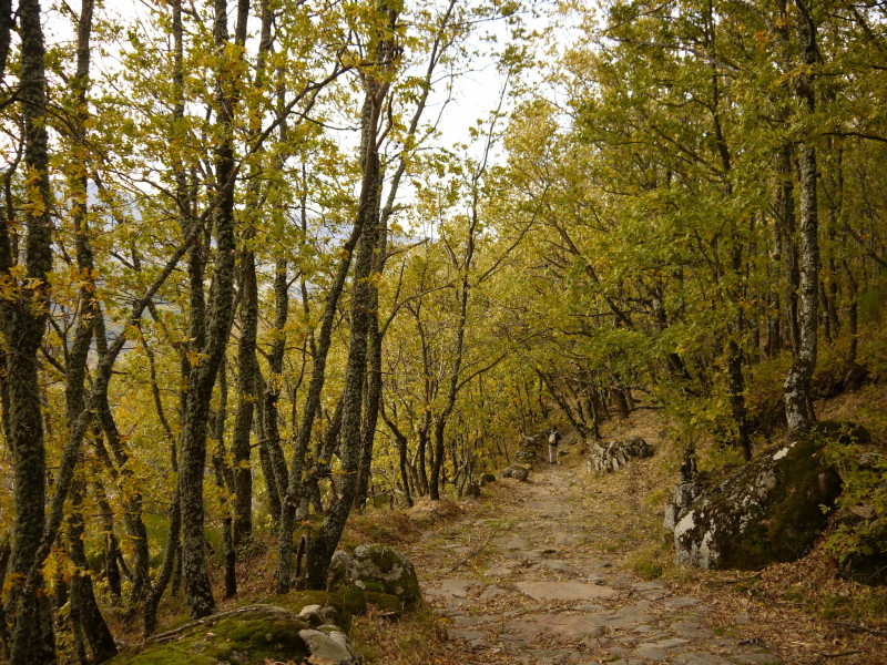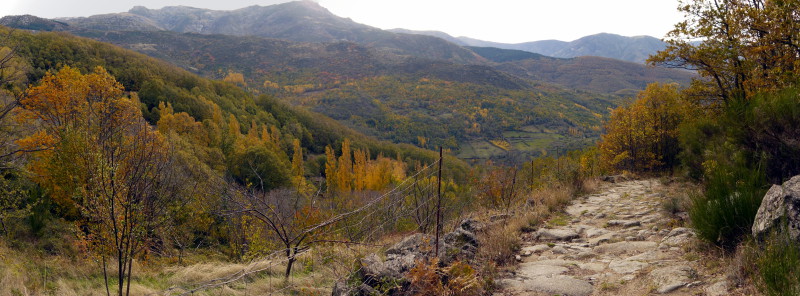 Unos metros después, en un claro, ya habremos coronado nuestra primera y corta subida, para comenzar con una larga bajada que nos llevará hasta Hervás, desde la que tendremos unas excelentes vistas de los bosques del Ambroz en estas fechas otoñales, teñidos de colores rojos, castaños, ocres… y conforme vamos bajando, nos iremos adentrando en estos bosques de robles y castaños, pasando de las zonas aclaradas de las partes más altas, a vernos inmersos en una umbría propiciada por la espesa arboleda de estos bosques, caminando entre sendas, caminos, tramos empedrados, pisando la hojarasca ocre, envueltos en gran parte del recorrido entre las sombras y la humedad reinante, rodeado de regueros y arroyos y disfrutando del espectáculo visual, además de hacer las delicias de los accionados a la micología…
