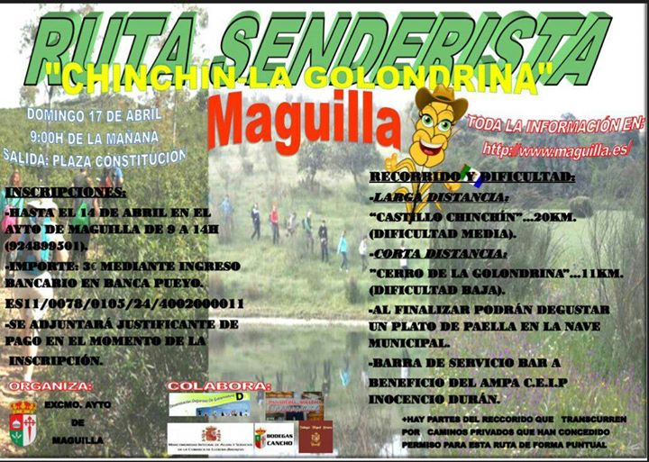 Para el domingo día 17 de abril, según lo previsto en nuestro calendario, tenemos la ruta en Maguilla, aunque se da la circunstancia de que el Ayuntamiento de dicha localidad ha organizado una ruta para esa misma fecha, en la que al finalizar obsequiarán a los participantes con un plato de paella, como ya conoceréis por los carteles que se han publicado.